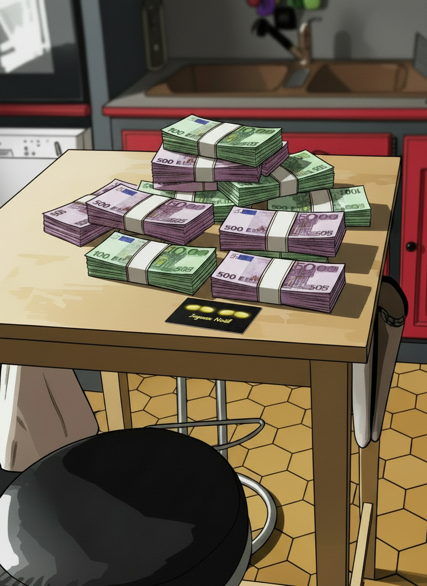 Les billets étaient soigneusement empilés et accompagnés d'une carte de visite. Une carte noire ornée de quatre cercles jaunes brillants dans le noir, avec l'inscription « Joyeux Noël » en dessous.
