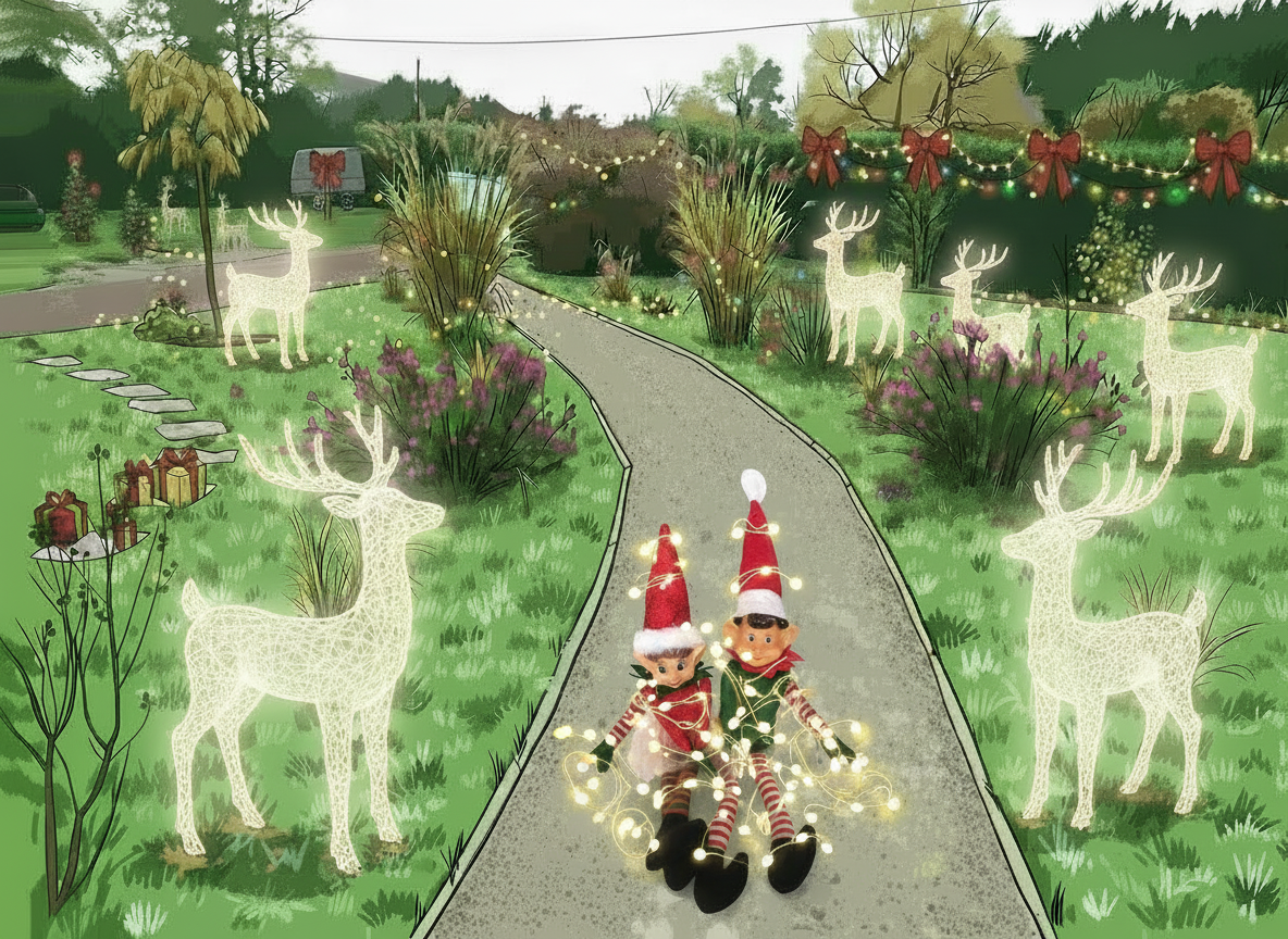 Dommage que par chez nous, il n'y ait pas de concours pour les plus belles décorations de Noël dans les jardins. Je suis persuadé que nous aurions triomphé aisément cette année grâce à nos deux petits lutins farceurs.